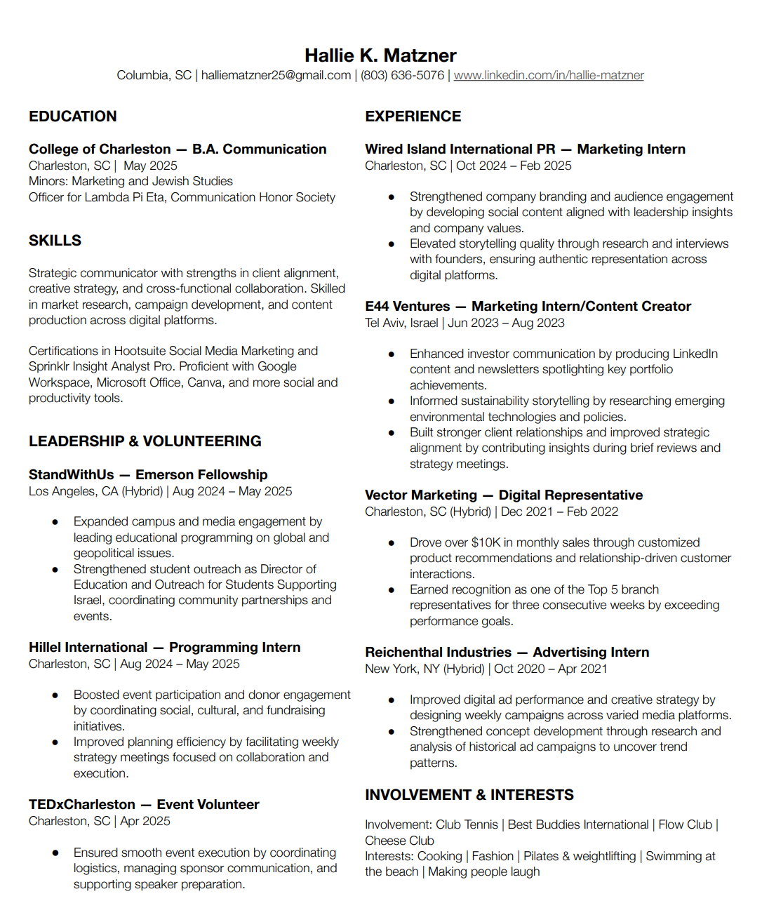 Hallie K. Matzner offers personalized, innovative communication solutions and strategic planning to showcase her values and expertise as she seeks to break into the advertising industry, particularly within independent agencies.